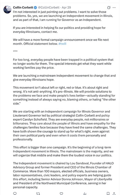 * Former GOP consultant Collin Corbett has announced an independent bid for Governor