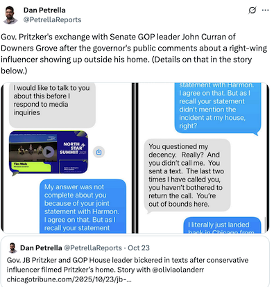 * Meanwhile… XTwitter isn’t allowing embeds right now, so click the pic to see the original. * And from the Pritzker campaign…
