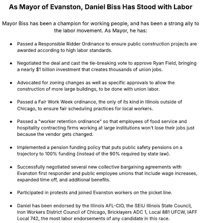 Wednesday, Dec 10, 2025 - Posted by Rich Miller * Some folks yesterday wondered why Evanston Mayor Daniel Biss won the Illinois AFL-CIO’s endorsement in the super-crowded 9th Congressional District Democratic primary. One reason is he achieved tangible results for union members. Click the pic for a larger image… * CD9 Democratic candidate Sen. Laura Fine publicly campaigned for the endorsement. I asked her for react…