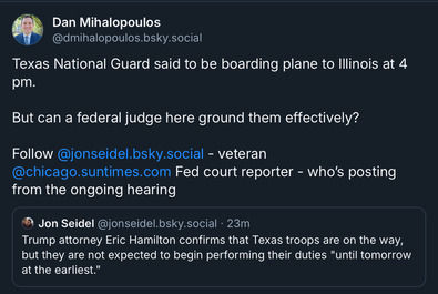 …as to where the troops will be and what they’ll be doing once here (combined with their ask for seven days to file a brief), she said the Feds’ assertion that it’ll take a few days once here to officially be truly deployed gives enough time. Oral arguments set for Thursday.