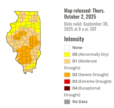 * Lawrence County Post | Illinois drought monitor says dry conditions to continue: No large rains are in the immediate forecast for next week. A windy, hot, dry weekend is in store which will lead to high fire danger across the area. Lawrence County fire officials remind residents that a burn ban continues until further notice.