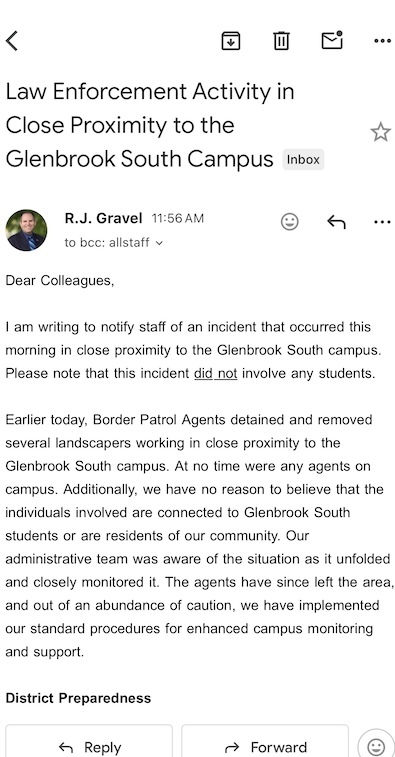 * Also, this letter was sent yesterday by Glenbrook High School District 225 Superintendent R.J. Gravel …