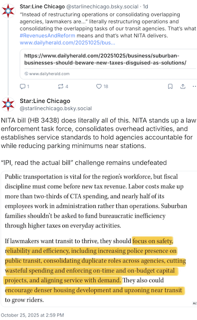 Lost in the noise on this is the fact that the CTA was paying people to stay home and not work; according to various IG reports published on this blog. The solution of “more revenue” is what gets tapped after you cut the waste, fraud and abuse. Make some reasonable efforts to cut the waste and then go look for more revenue. Gotta lay out a plan to clean up the mess, identify where existing expenses can be cleaned up, provide some better oversight, then come with a reasonable request for revenue. The CTA/METRA/RTA has handled this entire issue by mistaking the guide for “What Not To Do” for an instruction manual. Frankly, I think any bill should require new leadership across the board in all agencies. Better the risk of new, different idiots than the surety of the current fools.