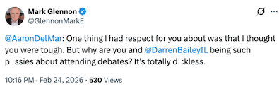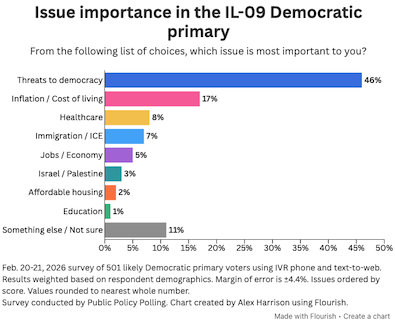 Click here for the crypto-backed ad attacking Rep. Ford. * More from Isabel… * Evanston Now | Dueling attack ads hit the airwaves: After this story was first published, the super PAC backing State Sen. Laura Fine’s campaign filed a report with the FEC disclosing its spending on the negative advertisements, totaling about $683,000. The super PAC had already spent over $1.9 million in pro-Fine ads to date. * WGN | Negative ads dominate Illinois primary races in final weeks: With just three weeks left before Primary Election Day in Illinois, the knives are out. Candidates and financial backers are on the airwaves with a slew of negative ads in several key races. Candidates running for Dick Durbin’s Senate seat are taking aim at each other in the homestretch, with accusations about where their funding comes from. There are also new attacks in the Republican race for Governor and the Cook County Assessor race. Political Editor Tahman Bradley sits down with multimedia journalist Brandon Pope and former State Representative Mike Zalewski to break down all the latest developments. * Sun-Times | Progressives pack Democratic primary race to replace U.S. Rep. Danny Davis: While all 13 Democratic primary candidates praised Davis’ legacy, they each told the Sun-Times their diverse district, winding from Englewood up the Loop and west to Austin and several suburbs, is due for a fresh voice in Washington to counter Trump administration policies and address the rising cost of living. Davis himself suggested that voice should come from another familiar West Side face, state Rep. La Shawn Ford, whom the congressman endorsed while announcing his retirement last summer. * Tribune | Lead prosecutor in ‘Broadview Six’ immigration protest case leaving for DC ahead of high-profile trial: The lead prosecutor in the politically charged ‘Broadview Six’ case accusing a group of Democrats and other protesters of conspiring to impede immigration agents at the Broadview ICE facility is leaving the office for a temporary detail in Washington D.C. […] In a motion filed Monday, the defendants said body-worn camera footage from Broadview police officers on the scene that day shows Abughazaleh move away from the agents’ vehicle she was allegedly impeding, grab a megaphone and tell the crowd “that’s private property back there — come back.” * Hyde Park Herald | Key candidates skip forum in crowded 2nd District race: While Ransby-Sporn said Miller was absent due to a scheduling conflict, state Sen. Willie Preston (D-16th) wasted little time offering his own explanation during his opening remarks. “Commissioner Miller is at a fundraiser right now, showing up for AIPAC and not for people in this room,” he said. “That’s the type of Congresswoman that she’s going to be if elected.” Miller’s campaign denied attending an AIPAC fundraiser, saying she was at two events “talking to Democratic primary voters,” one of which was at the Chicago Southland Chamber of Commerce in Hazel Crest. Preston did not provide evidence for this claim when asked by the Herald. * Daily Herald | Who’s going to the State of the Union and who’s boycotting it? Illinois lawmakers are split: A Dreamer who inspired legislation, the founder of a health care clinic that helps uninsured patients, and a suburban executive who successfully sued the Trump administration over tariffs are among the guests Democratic Illinois lawmakers will bring to the State of the Union address. Meanwhile, several legislators are boycotting the Tuesday speech, including U.S. Rep. Jan Schakowsky, who said her office “has been flooded with calls asking me to skip this speech and take a stand.”